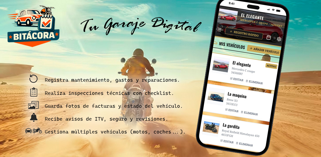 - Editar: Usa el botón "Editar" para cambiar el nombre, añadir la matrícula, fecha de ITV, seguro o cambiar la foto de cabecera y el logo.